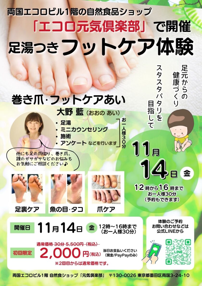 🦶【両国】足湯つきフットケア体験会|巻き爪・タコ・魚の目ケアも 足元から健康を整える「足湯つきフットケア体験」を開催します! 両国エコロビル1階の自然食品ショップ「エコロ元気倶楽部」で、冷えや疲れを癒やし…